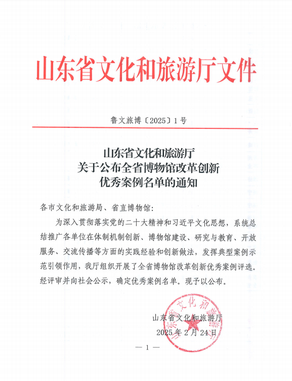 2月24日,山东省文化和旅游厅下发《关于2025年全省博物馆改革创新优秀案例入选名单的通知》(鲁文旅博﹝2025﹞1号),